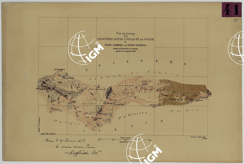 PLAN DU BORNAGE DE LA FRONTIERE ENTRE L’ITALIE ET LA SUISSE DU PIZZO COLOMBO AU SASSO LUGHINA. ANNEXE AU PROCES-VRBALDU BORNAGE EXECUTE’ LE 29 SEPTEMBRE 1° COPIA