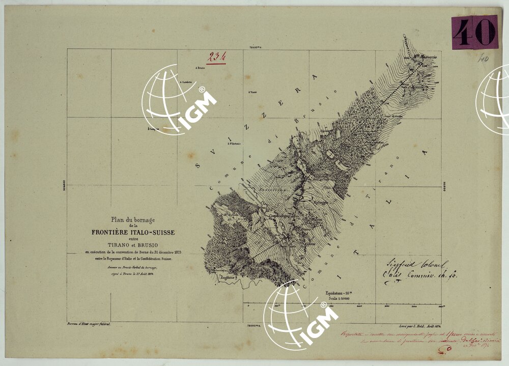 | Titolo proprio | PLAN DU BORNAGE DE LA FRONTIERE ITALO-SUISSE ENTRE TIRANO E BRUSIO EN EXECUTION DE LA COVENTION DE BERNE DU 31 DECEMBRE 1873 ENTRE LE ROYAUME D'ITALIE ET LA CONFEDERATION SUISSE. ANNEXE AU PROCES-VERBAL DU BORNAGE SIGNE'A'TIRANO LE 27 AOUT 1874. 2° COPIA |