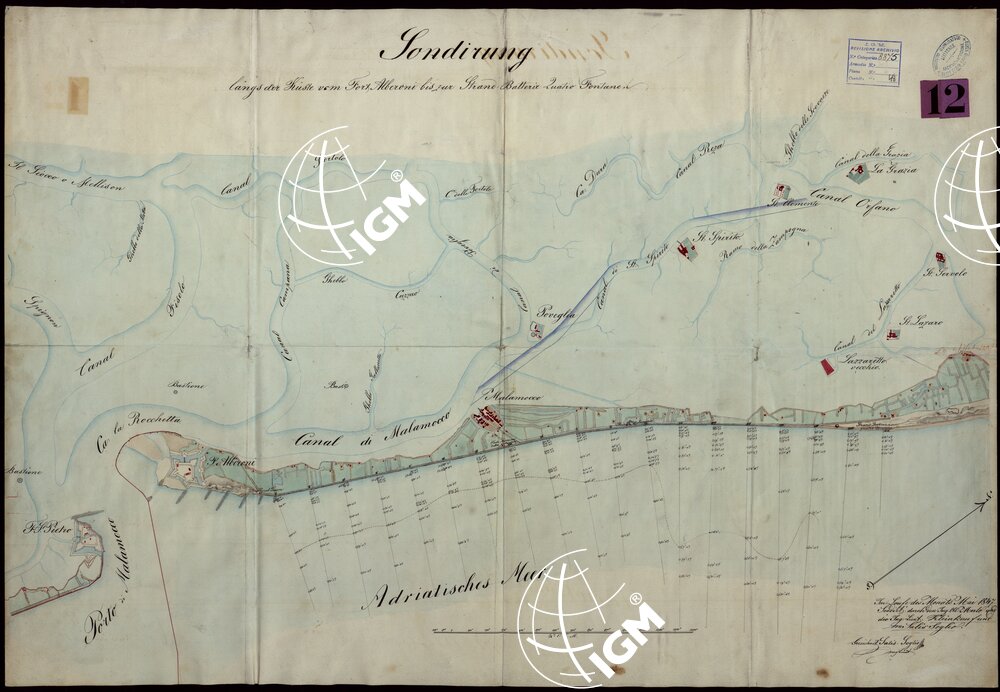 Copia della carta del Denaix eseguita dal 1800 al 1808 alla scala di 1:18.000 in trenta fogli. Il disegno fu eseguito nel 1836 la riduzione nel 1837 a spesa del Genio terrestre austriaco. Consta di trenta fogli ad acquerello montati su tela. Colori usati : azzurro per l’idrografia, rosso per gli abitati e le strade principali, verde per le coltivazioni. Il foglio 1 contiene il quadro di unione. I fogli 9 e 10 recano il titolo; il foglio 20 contiene notizie sulla costruzione della carta: il foglio 25 la rosa dei venti; il foglio 30 notizie sulla luguna. Annessi alla carta sono un piano del Forte di S.Pietro pure ad acquerello alla scala di 1:2.500 e una carta dei “sondaggi lungo la costa tra il Forte Alberone e la Batteria Quattro Fontane” firmata “Salis Soglio maggio 1847”.