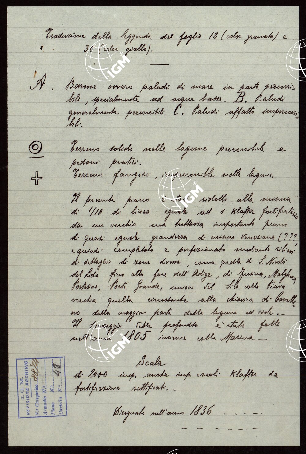 Copia della carta del Denaix eseguita dal 1800 al 1808 alla scala di 1:18.000 in trenta fogli. Il disegno fu eseguito nel 1836 la riduzione nel 1837 a spesa del Genio terrestre austriaco. Consta di trenta fogli ad acquerello montati su tela. Colori usati : azzurro per l’idrografia, rosso per gli abitati e le strade principali, verde per le coltivazioni. Il foglio 1 contiene il quadro di unione. I fogli 9 e 10 recano il titolo; il foglio 20 contiene notizie sulla costruzione della carta: il foglio 25 la rosa dei venti; il foglio 30 notizie sulla luguna. Annessi alla carta sono un piano del Forte di S.Pietro pure ad acquerello alla scala di 1:2.500 e una carta dei “sondaggi lungo la costa tra il Forte Alberone e la Batteria Quattro Fontane” firmata “Salis Soglio maggio 1847”.