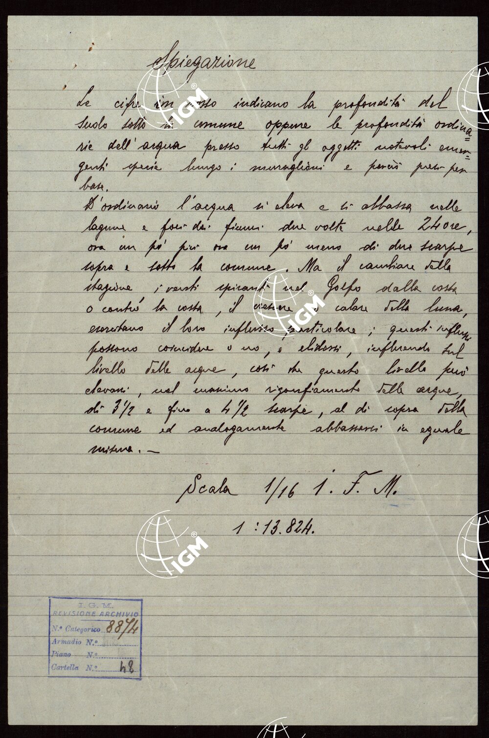 Copia della carta del Denaix eseguita dal 1800 al 1808 alla scala di 1:18.000 in trenta fogli. Il disegno fu eseguito nel 1836 la riduzione nel 1837 a spesa del Genio terrestre austriaco. Consta di trenta fogli ad acquerello montati su tela. Colori usati : azzurro per l’idrografia, rosso per gli abitati e le strade principali, verde per le coltivazioni. Il foglio 1 contiene il quadro di unione. I fogli 9 e 10 recano il titolo; il foglio 20 contiene notizie sulla costruzione della carta: il foglio 25 la rosa dei venti; il foglio 30 notizie sulla luguna. Annessi alla carta sono un piano del Forte di S.Pietro pure ad acquerello alla scala di 1:2.500 e una carta dei “sondaggi lungo la costa tra il Forte Alberone e la Batteria Quattro Fontane” firmata “Salis Soglio maggio 1847”.