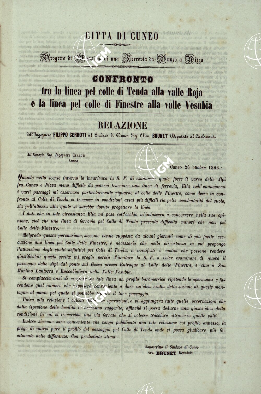 Progetto di massima di una Ferrovia da Cuneo a Nizza. Confronto tra la linea pel colle di Tenda alla valle Roja e la linea pel colle di Finestre alla valle Vesubia.