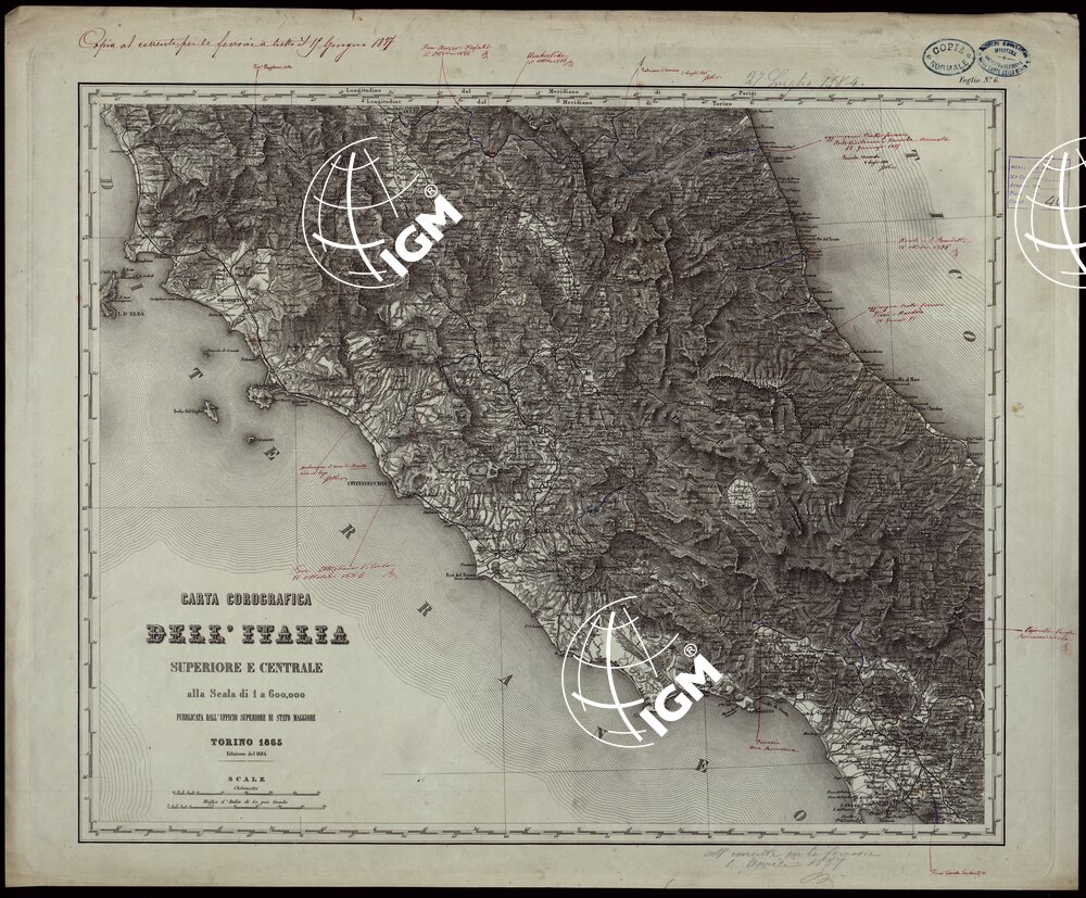 Subito dopo le prime annesioni del 1859 il Governo sentì il bisogno di avere una carta generale di tutte le provincie dell’alta e media Italia recentemente annesse. Per velocizzare le operazioni si utilizzarono i materiali già esistenti. Perciò presso l’Ufficio Superiore di Stato Maggiore (Torino) vennero completati i quattro rami già esistenti della “Carta Corografica delle Alpi” annessa all’opera: ” Le Alpi che cingono l’Italia”. Per il quinto foglio si trasse partito della carta dell’Isola di Sardegna del Generale Alberto la marmora. Per il sesto si fece una riduzione della corrispondente parte della carta austriaca dell’Italia centrale alla scala di 1:86.400 e per la parte napoletana di quella del Rizzi Zannoni alla scala di un decimetro per 6 miglia geografiche di 60 al grado. Furono preventivamente introdotte sui rami e nelle riduzioni le principali varianti riscontrate nella topografia e nel sistema stradale ed idrografico dei paesi rappresentati. L’orografia è indicata col tratteggio a luce obliqua. I meridiani tracciati si riferiscono all’Osservatorio di Parigi, ma sui margini dei fogli vi è anche la graduazione che si riferisce all’Osservatorio di Torino. Il campo disegnato è nei primi 4 fogli di m.0,604×0,375 e negli altri è di m.0,604×0,487. I rami incisi, avendo servito alla stampa di centinaia di copie sono ormai logori.