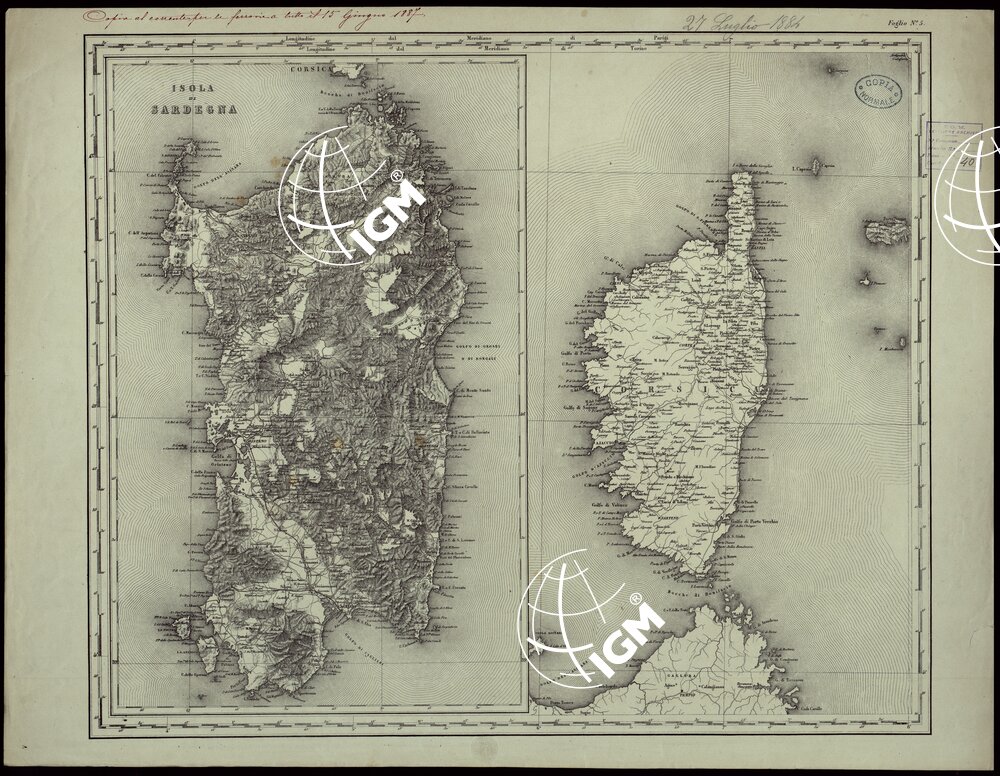 Subito dopo le prime annesioni del 1859 il Governo sentì il bisogno di avere una carta generale di tutte le provincie dell’alta e media Italia recentemente annesse. Per velocizzare le operazioni si utilizzarono i materiali già esistenti. Perciò presso l’Ufficio Superiore di Stato Maggiore (Torino) vennero completati i quattro rami già esistenti della “Carta Corografica delle Alpi” annessa all’opera: ” Le Alpi che cingono l’Italia”. Per il quinto foglio si trasse partito della carta dell’Isola di Sardegna del Generale Alberto la marmora. Per il sesto si fece una riduzione della corrispondente parte della carta austriaca dell’Italia centrale alla scala di 1:86.400 e per la parte napoletana di quella del Rizzi Zannoni alla scala di un decimetro per 6 miglia geografiche di 60 al grado. Furono preventivamente introdotte sui rami e nelle riduzioni le principali varianti riscontrate nella topografia e nel sistema stradale ed idrografico dei paesi rappresentati. L’orografia è indicata col tratteggio a luce obliqua. I meridiani tracciati si riferiscono all’Osservatorio di Parigi, ma sui margini dei fogli vi è anche la graduazione che si riferisce all’Osservatorio di Torino. Il campo disegnato è nei primi 4 fogli di m.0,604×0,375 e negli altri è di m.0,604×0,487. I rami incisi, avendo servito alla stampa di centinaia di copie sono ormai logori.