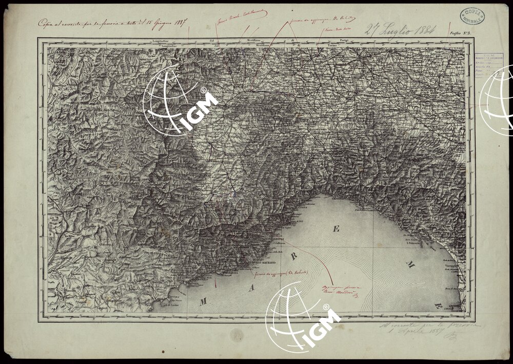 Subito dopo le prime annesioni del 1859 il Governo sentì il bisogno di avere una carta generale di tutte le provincie dell’alta e media Italia recentemente annesse. Per velocizzare le operazioni si utilizzarono i materiali già esistenti. Perciò presso l’Ufficio Superiore di Stato Maggiore (Torino) vennero completati i quattro rami già esistenti della “Carta Corografica delle Alpi” annessa all’opera: ” Le Alpi che cingono l’Italia”. Per il quinto foglio si trasse partito della carta dell’Isola di Sardegna del Generale Alberto la marmora. Per il sesto si fece una riduzione della corrispondente parte della carta austriaca dell’Italia centrale alla scala di 1:86.400 e per la parte napoletana di quella del Rizzi Zannoni alla scala di un decimetro per 6 miglia geografiche di 60 al grado. Furono preventivamente introdotte sui rami e nelle riduzioni le principali varianti riscontrate nella topografia e nel sistema stradale ed idrografico dei paesi rappresentati. L’orografia è indicata col tratteggio a luce obliqua. I meridiani tracciati si riferiscono all’Osservatorio di Parigi, ma sui margini dei fogli vi è anche la graduazione che si riferisce all’Osservatorio di Torino. Il campo disegnato è nei primi 4 fogli di m.0,604×0,375 e negli altri è di m.0,604×0,487. I rami incisi, avendo servito alla stampa di centinaia di copie sono ormai logori.