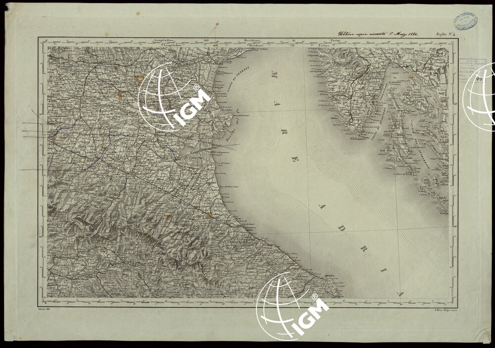 Subito dopo le prime annesioni del 1859 il Governo sentì il bisogno di avere una carta generale di tutte le provincie dell’alta e media Italia recentemente annesse. Per velocizzare le operazioni si utilizzarono i materiali già esistenti. Perciò presso l’Ufficio Superiore di Stato Maggiore (Torino) vennero completati i quattro rami già esistenti della “Carta Corografica delle Alpi” annessa all’opera: ” Le Alpi che cingono l’Italia”. Per il quinto foglio si trasse partito della carta dell’Isola di Sardegna del Generale Alberto la marmora. Per il sesto si fece una riduzione della corrispondente parte della carta austriaca dell’Italia centrale alla scala di 1:86.400 e per la parte napoletana di quella del Rizzi Zannoni alla scala di un decimetro per 6 miglia geografiche di 60 al grado. Furono preventivamente introdotte sui rami e nelle riduzioni le principali varianti riscontrate nella topografia e nel sistema stradale ed idrografico dei paesi rappresentati. L’orografia è indicata col tratteggio a luce obliqua. I meridiani tracciati si riferiscono all’Osservatorio di Parigi, ma sui margini dei fogli vi è anche la graduazione che si riferisce all’Osservatorio di Torino. Il campo disegnato è nei primi 4 fogli di m.0,604×0,375 e negli altri è di m.0,604×0,487. I rami incisi, avendo servito alla stampa di centinaia di copie sono ormai logori.