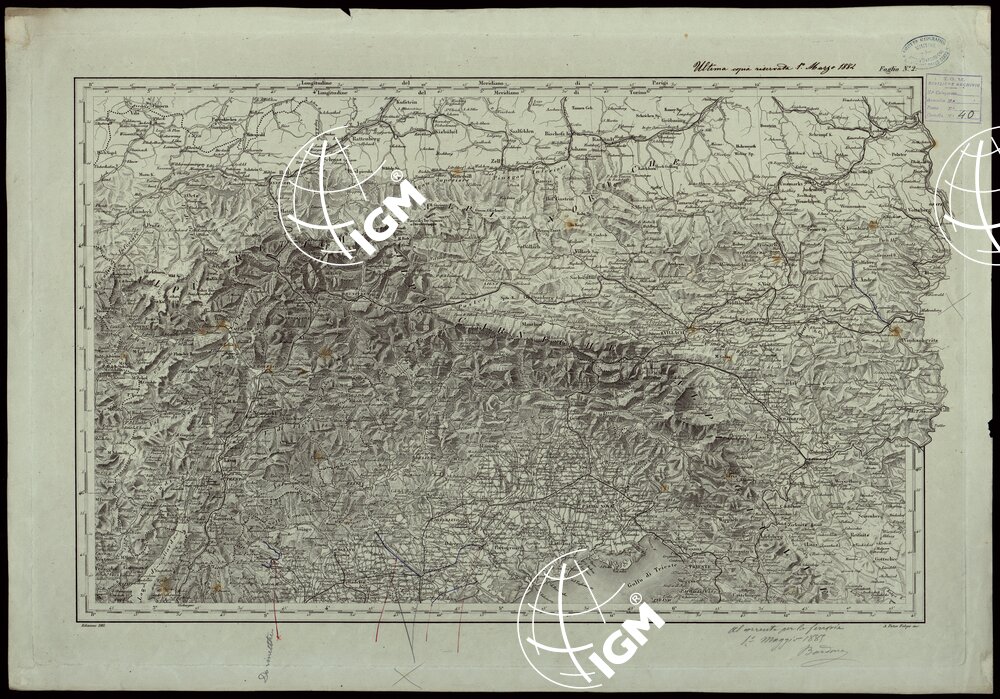 Subito dopo le prime annesioni del 1859 il Governo sentì il bisogno di avere una carta generale di tutte le provincie dell’alta e media Italia recentemente annesse. Per velocizzare le operazioni si utilizzarono i materiali già esistenti. Perciò presso l’Ufficio Superiore di Stato Maggiore (Torino) vennero completati i quattro rami già esistenti della “Carta Corografica delle Alpi” annessa all’opera: ” Le Alpi che cingono l’Italia”. Per il quinto foglio si trasse partito della carta dell’Isola di Sardegna del Generale Alberto la Marmora. Per il sesto si fece una riduzione della corrispondente parte della carta austriaca dell’Italia centrale alla scala di 1:86.400 e per la parte napoletana di quella del Rizzi Zannoni alla scala di un decimetro per 6 miglia geografiche di 60 al grado. Furono preventivamente introdotte sui rami e nelle riduzioni le principali varianti riscontrate nella topografia e nel sistema stradale ed idrografico dei paesi rappresentati. L’orografia è indicata col tratteggio a luce obliqua. I meridiani tracciati si riferiscono all’Osservatorio di Parigi, ma sui margini dei fogli vi è anche la graduazione che si riferisce all’Osservatorio di Torino. Il campo disegnato è nei primi 4 fogli di m.0,604×0,375 e negli altri è di m.0,604×0,487. I rami incisi, avendo servito alla stampa di centinaia di copie sono ormai logori.