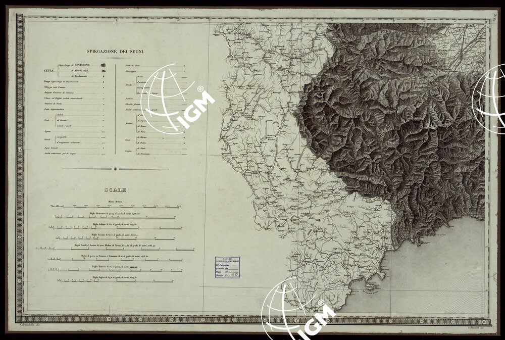 Carta pregevolissima in sei fogli incisi su rame da A. Lecoq, G. Arghinenti, G. Biasoli stampati in nero, riduzione della Carta Topografica in 90 fogli alla scala di 1:50.000 dello stesso R. Corpo di S. M. Generale. Proiezione di Flamstead modificata. Origine delle coordinate il R. Osservatorio di Torino. Orografia rappresentata con fine artistico tratteggio a luce obliqua. Abitati distinti in base alla loro importanza amministrativa; strade classificate in reali, provinciali, carreggiabili, mulattiere. Sono inoltre indicati ponti, argini, canali, acque termali, miniere, cave, ecc., e i confini di stato e di provincia. Il foglio n. 2 contiene il titolo e un “Cenno sulla formazione della carta”. Il foglio n. 5 contiene la leggenda dei segni convenzionali e le scale grafiche (8, in misure antiche italiane ed estere) Nel foglio n. 6 trovasi una cartina sussidiaria per l’Isola di Capraia.