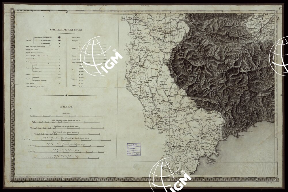 Carta pregevolissima in sei fogli incisi su rame da A. Lecoq, G. Arghinenti, G. Biasoli stampati in nero, riduzione della Carta Topografica in 90 fogli alla scala di 1:50.000 dello stesso R. Corpo di S. M. Generale. Proiezione di Flamstead modificata. Origine delle coordinate il R. Osservatorio di Torino. Orografia rappresentata con fine artistico tratteggio a luce obliqua. Abitati distinti in base alla loro importanza amministrativa; strade classificate in reali, provinciali, carreggiabili, mulattiere. Sono inoltre indicati ponti, argini, canali, acque termali, miniere, cave, ecc., e i confini di stato e di provincia. Il foglio n. 2 contiene il titolo e un “Cenno sulla formazione della carta”. Il foglio n. 5 contiene la leggenda dei segni convenzionali e le scale grafiche (8, in misure antiche italiane ed estere) Nel foglio n. 6 trovasi una cartina sussidiaria per l’Isola di Capraia.