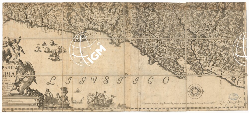 CARTA DE LA RIVERA DE GENOVA CON SUS VERDADEROS CONFINES Y CAMINOS TOPOGRAPHIA DE LA LIGURIA DEDICADA A LCELL.MO SENOR CONDE DE MELGAR GOVERNADORY CAPITAN GENERAL DEL ESTADO DE MILAN POR D. JOSEPH CHAFRION ING. DEL EX QHIZOY DEL MDCLXXXV – FOGLIO 4