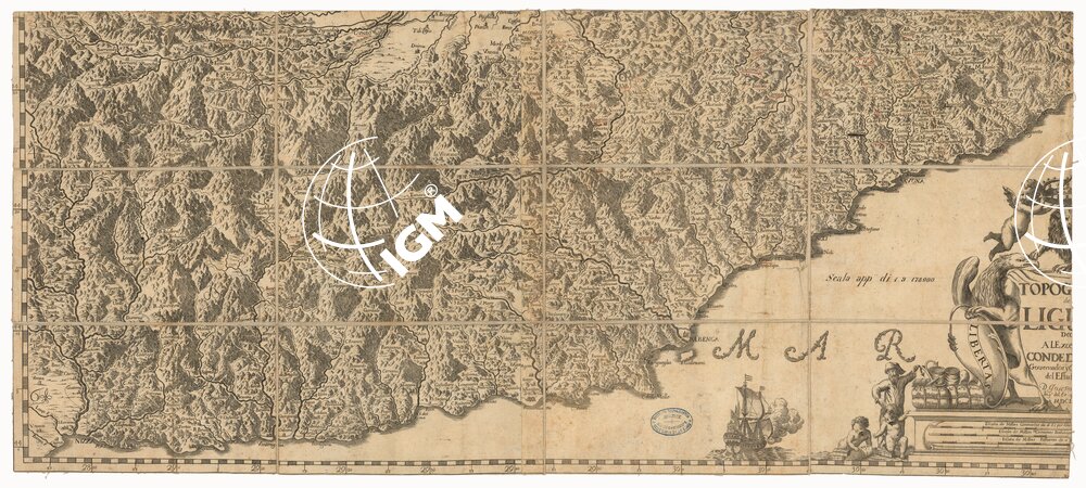 CARTA DE LA RIVERA DE GENOVA CON SUS VERDADEROS CONFINES Y CAMINOS TOPOGRAPHIA DE LA LIGURIA DEDICADA A LCELL.MO SENOR CONDE DE MELGAR GOVERNADORY CAPITAN GENERAL DEL ESTADO DE MILAN POR D. JOSEPH CHAFRION ING. DEL EX QHIZOY DEL MDCLXXXV – FOGLIO 3