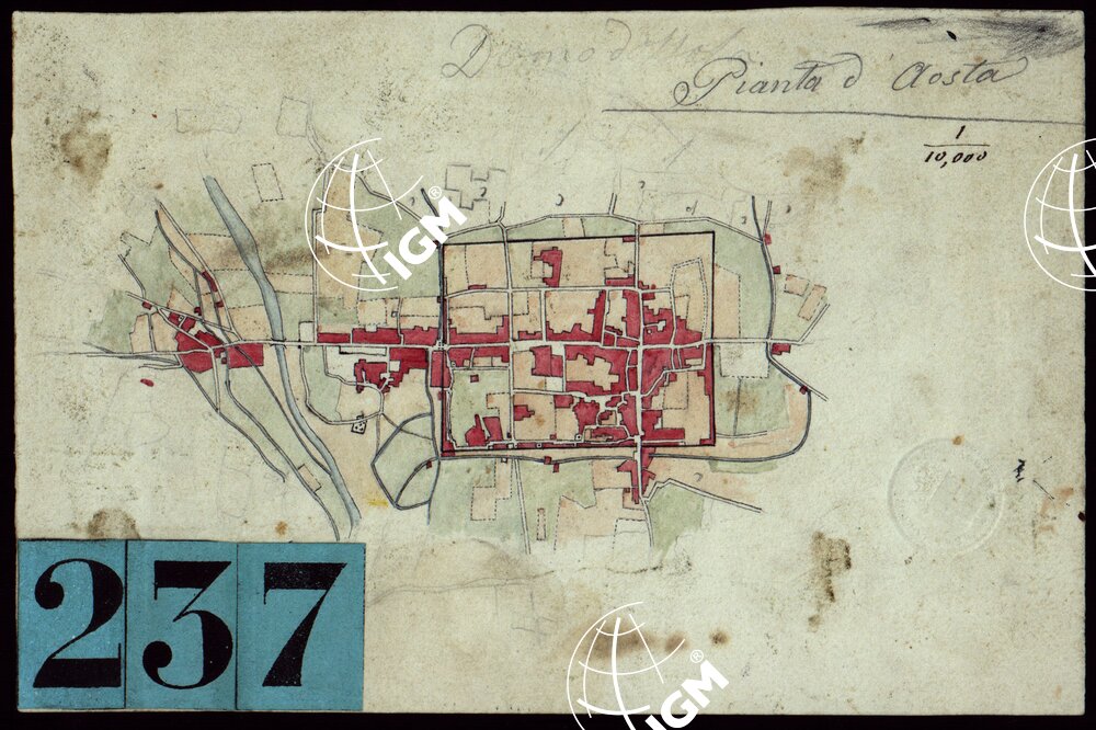 Un foglio composto di minute di campagna unite a mosaico, dei rilevamenti eseguiti 1820. Firma supposta originale di F. Muletti. Orografia a tratteggio, abitati in rosso, acque in azzurro. Annesso un fascicolo manoscritto contenente un “catalogo di nomi” e una piantina di Aosta al 10.000.