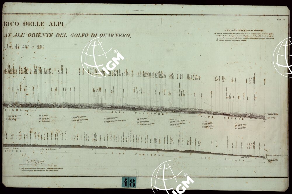 Incisioni eseguite per l’opera del Saluzzo:” Le Alpi che cingano l’Italia considerata militarmente così nell’antica come nella presente loro condizione” pubblicata nel 1845 (documento n°5). Sono segnate le cime della catena alpina da Verona passando da Venezia fino a Fiume. Alla scala di 1:200.000 per le Altitudine.