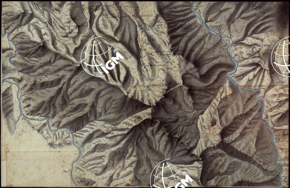 Gruppo di 100 minute di campagna dei rilevamenti eseguiti negli anni 1816-27 dagli Ufficiali del Corpo di S. M. Capitani D’Isaia Albert e Salasco, Tenenti D’Angennes, Quaglia, Roberti e Scoti, i Sottotenenti Alberti, Bergalli, Mariani, Muletti e S. Marzano. Queste minute sono tutte disegnate artisticamente ad acquerello: rappresentano l’orografia con lo sfumo a luce obliqua, gli abitati in rosso, le acque in azzurro, vegetazioni e colture in verde, strade in nero.