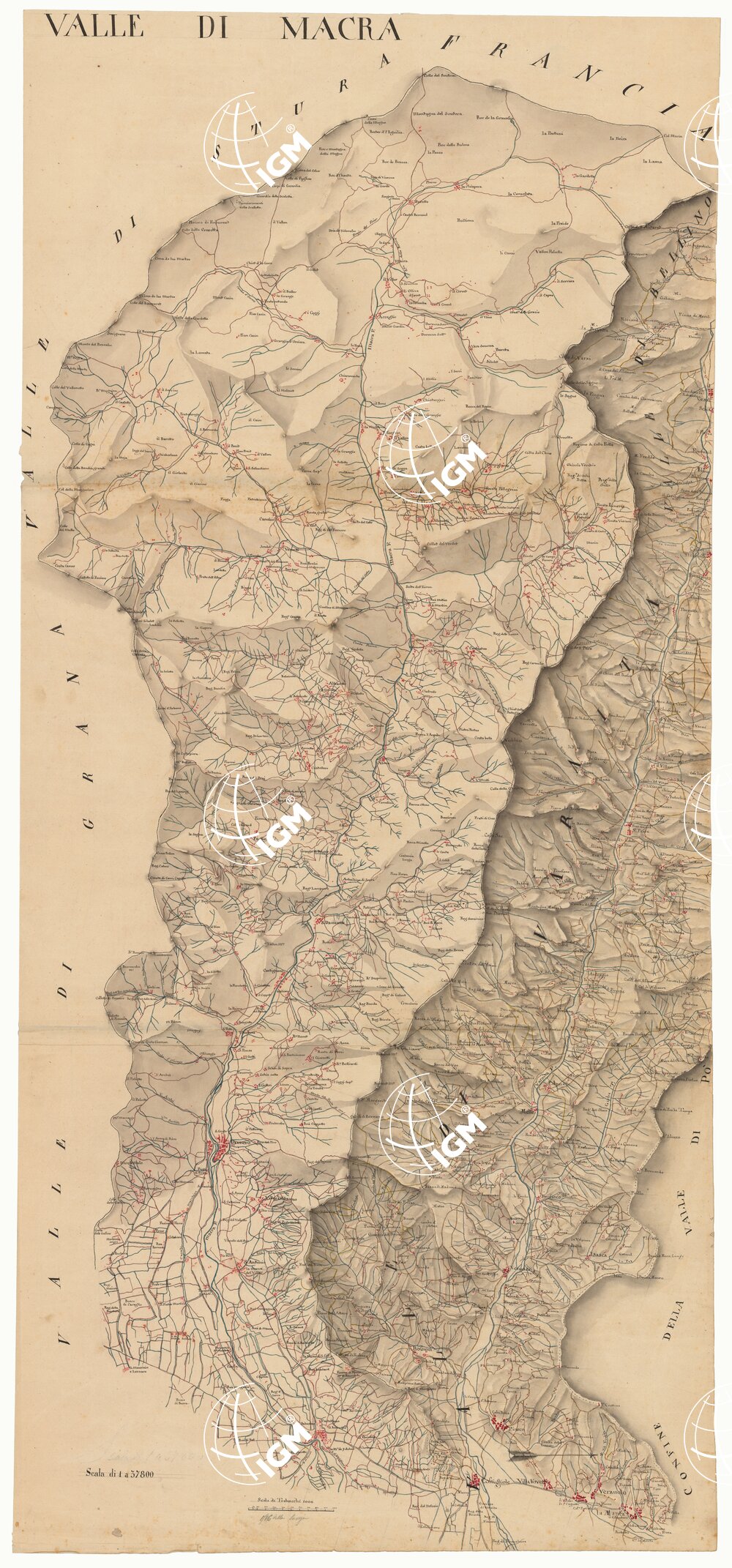 Disegno ad acquerello con orografia a sfumo a luce obliqua, abitati in rosso, acque in azzurro, strade in rosso e in giallo. E’ orientato col nord volto verso destra.