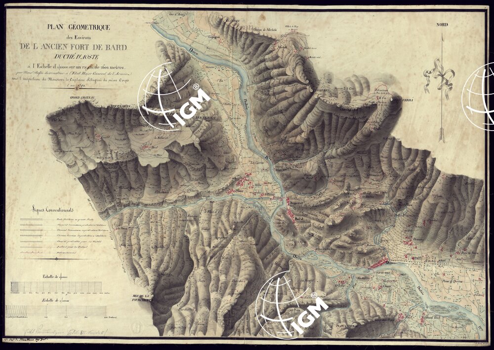 PLAN GEOMETRIQUE DES ENVIRONS DE L’ANCIEN FORT DE BARD DUCHE’ D’AOSTA. LEVE SUR UN RAYON DE 2.600 METRES A’L’EHCELLE DE 1:1.000 PAR M. BASSO DESSINATEUR A’L’ETAT MAJOR GENERAL DE L’ARMEE SOUS L’INSPECTION DE MONSIEUR LE CAPITAINE PELLEGRINI DU MEME CORPS.