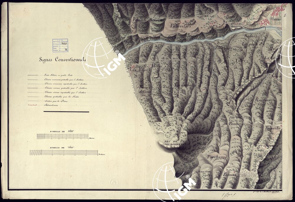 PLAN GEOMETRIQUE DES ENVIRONS DE L'ANCIEN FORT DE BARD DUCHE' D'AOSTA. LEVE SUR UN RAYON DE 2.600 METRES A'L'EHCELLE DE 1:5.000 PAR M. BASSO DESSINATEUR A' L'ETAT MAJOR GENERAL L'AN 1819. FOGLIO 3.