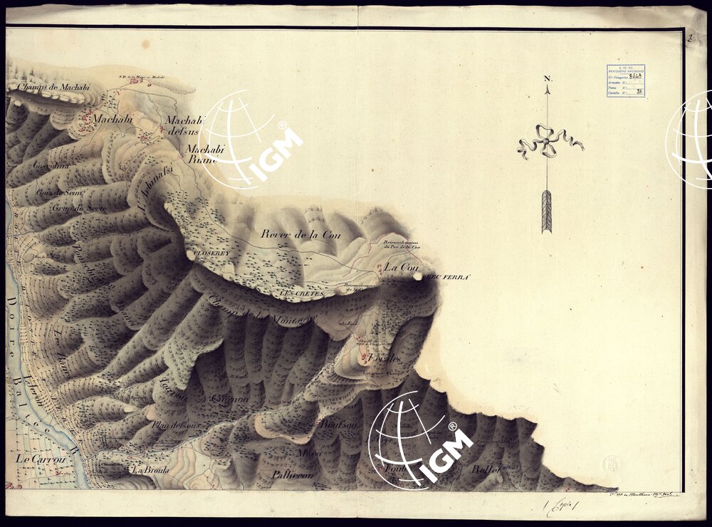 PLAN GEOMETRIQUE DES ENVIRONS DE L'ANCIEN FORT DE BARD DUCHE' D'AOSTA. LEVE SUR UN RAYON DE 2.600 METRES A'L'EHCELLE DE 1:5.000 PAR M. BASSO DESSINATEUR A' L'ETAT MAJOR GENERAL L'AN 1819. FOGLIO 2.