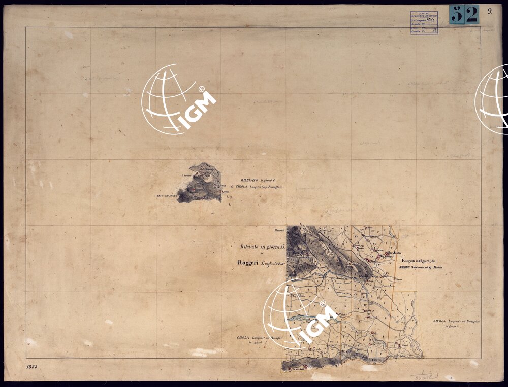 Nove fogli montati su tela, più un quadro d'unione, originali delle levate eseguite nel 1853 dagli ufficiali ammessi al corso di studi presso il Corpo di S.M. accuratamente disegnati e tratteggiati e recanti il visto del Maggiore A. Righini, Direttore dell'Istruzione. Il documento n°53 è la riunione delle levate su foglio unico montato su tela con dimensioni m.0,50×0,60 entro il campo disegnato. Il documento n°54 è la riproduzione al 50.000 dei disegni precedenti senza scritture, data e firma.