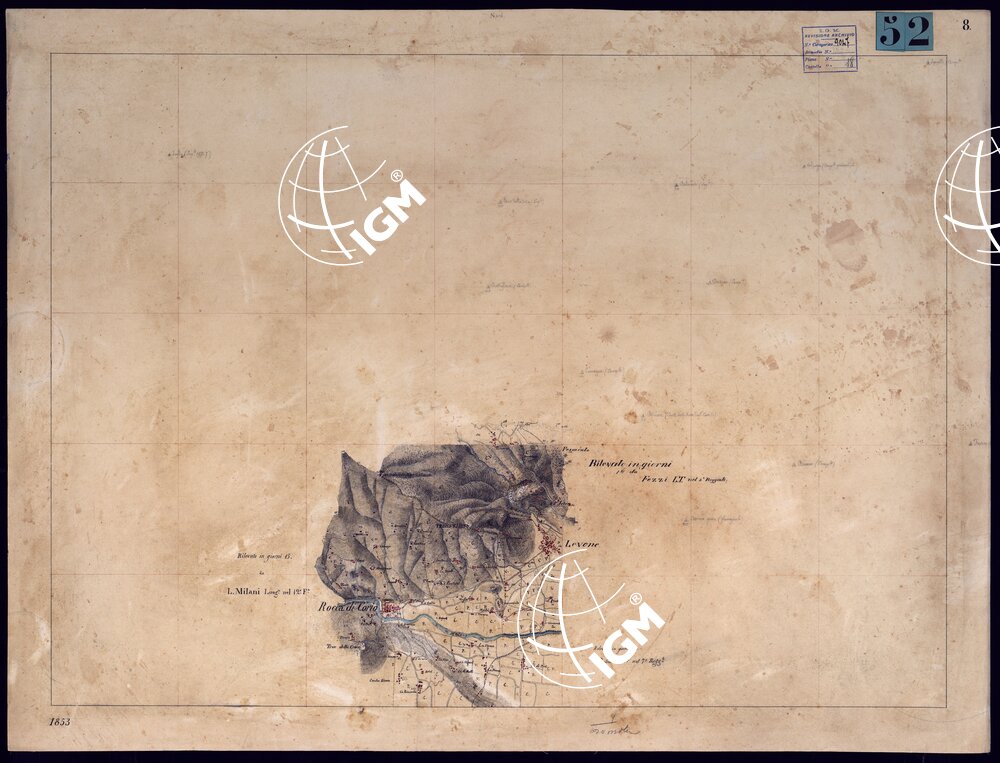 Nove fogli montati su tela, più un quadro d'unione, originali delle levate eseguite nel 1853 dagli ufficiali ammessi al corso di studi presso il Corpo di S.M. accuratamente disegnati e tratteggiati e recanti il visto del Maggiore A. Righini, Direttore dell'Istruzione. Il documento n°53 è la riunione delle levate su foglio unico montato su tela con dimensioni m.0,50×0,60 entro il campo disegnato. Il documento n°54 è la riproduzione al 50.000 dei disegni precedenti senza scritture, data e firma.