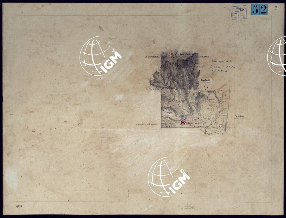 Nove fogli montati su tela, più un quadro d'unione, originali delle levate eseguite nel 1853 dagli ufficiali ammessi al corso di studi presso il Corpo di S.M. accuratamente disegnati e tratteggiati e recanti il visto del Maggiore A. Righini, Direttore dell'Istruzione. Il documento n°53 è la riunione delle levate su foglio unico montato su tela con dimensioni m.0,50×0,60 entro il campo disegnato. Il documento n°54 è la riproduzione al 50.000 dei disegni precedenti senza scritture, data e firma.