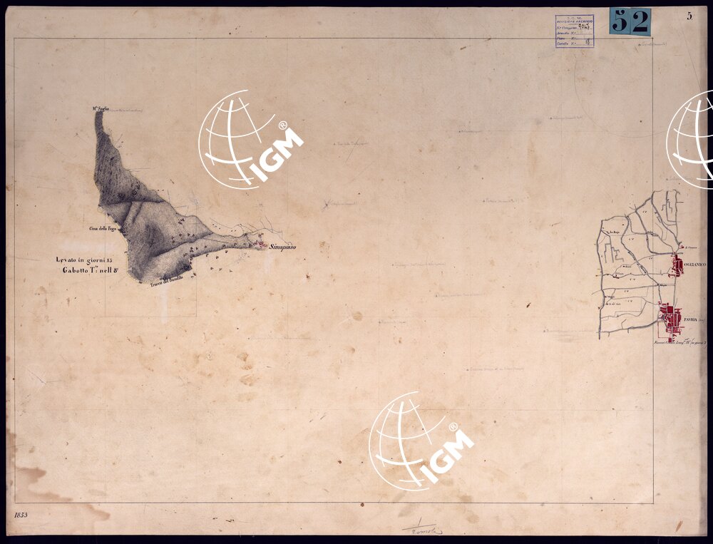 Nove fogli montati su tela, più un quadro d'unione, originali delle levate eseguite nel 1853 dagli ufficiali ammessi al corso di studi presso il Corpo di S.M. accuratamente disegnati e tratteggiati e recanti il visto del Maggiore A. Righini, Direttore dell'Istruzione. Il documento n°53 è la riunione delle levate su foglio unico montato su tela con dimensioni m.0,50×0,60 entro il campo disegnato. Il documento n°54 è la riproduzione al 50.000 dei disegni precedenti senza scritture, data e firma.