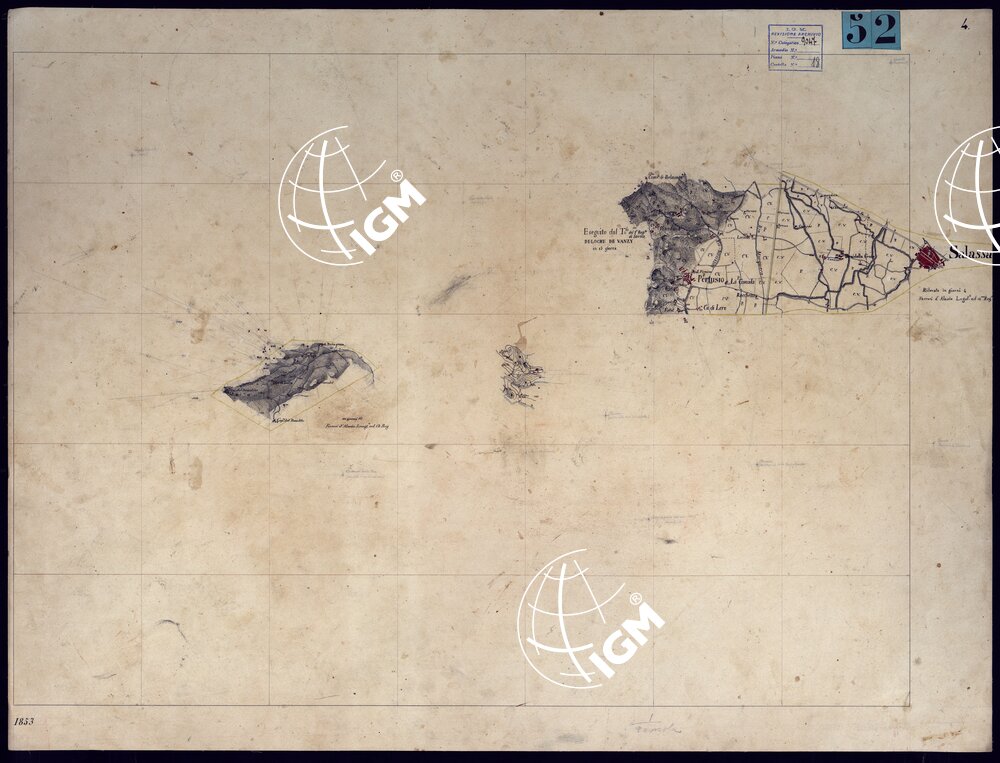 Nove fogli montati su tela, più un quadro d’unione, originali delle levate eseguite nel 1853 dagli ufficiali ammessi al corso di studi presso il Corpo di S.M. accuratamente disegnati e tratteggiati e recanti il visto del Maggiore A. Righini, Direttore dell’Istruzione. Il documento n°53 è la riunione delle levate su foglio unico montato su tela con dimensioni m.0,50×0,60 entro il campo disegnato. Il documento n°54 è la riproduzione al 50.000 dei disegni precedenti senza scritture, data e firma.