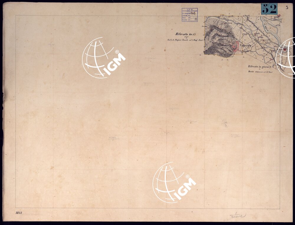 Nove fogli montati su tela, più un quadro d'unione, originali delle levate eseguite nel 1853 dagli ufficiali ammessi al corso di studi presso il Corpo di S.M. accuratamente disegnati e tratteggiati e recanti il visto del Maggiore A. Righini, Direttore dell'Istruzione. Il documento n°53 è la riunione delle levate su foglio unico montato su tela con dimensioni m.0,50×0,60 entro il campo disegnato. Il documento n°54 è la riproduzione al 50.000 dei disegni precedenti senza scritture, data e firma.