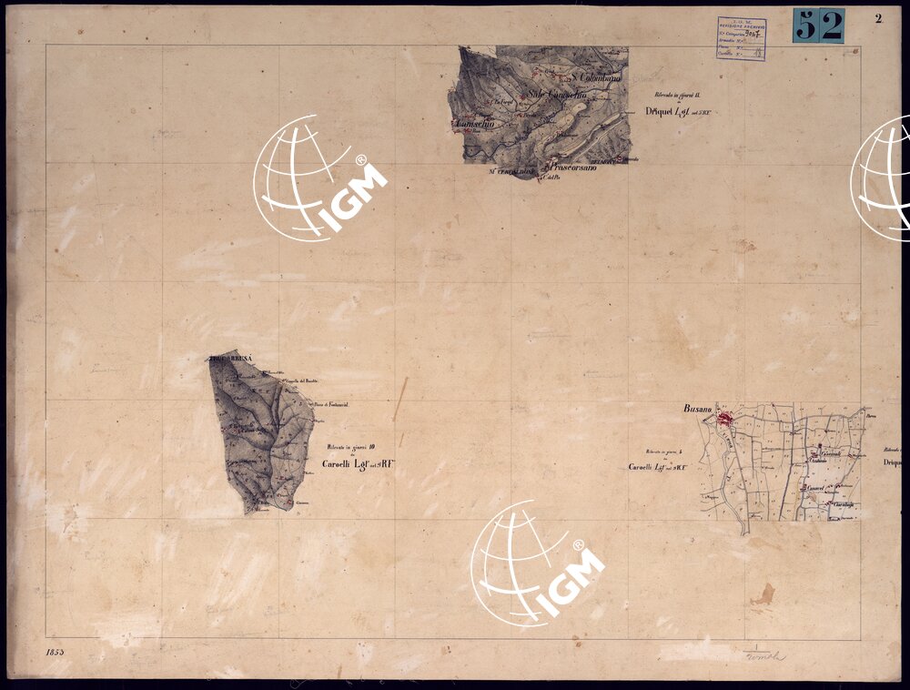 Nove fogli montati su tela, più un quadro d'unione, originali delle levate eseguite nel 1853 dagli ufficiali ammessi al corso di studi presso il Corpo di S.M. accuratamente disegnati e tratteggiati e recanti il visto del Maggiore A. Righini, Direttore dell'Istruzione. Il documento n°53 è la riunione delle levate su foglio unico montato su tela con dimensioni m.0,50×0,60 entro il campo disegnato. Il documento n°54 è la riproduzione al 50.000 dei disegni precedenti senza scritture, data e firma.