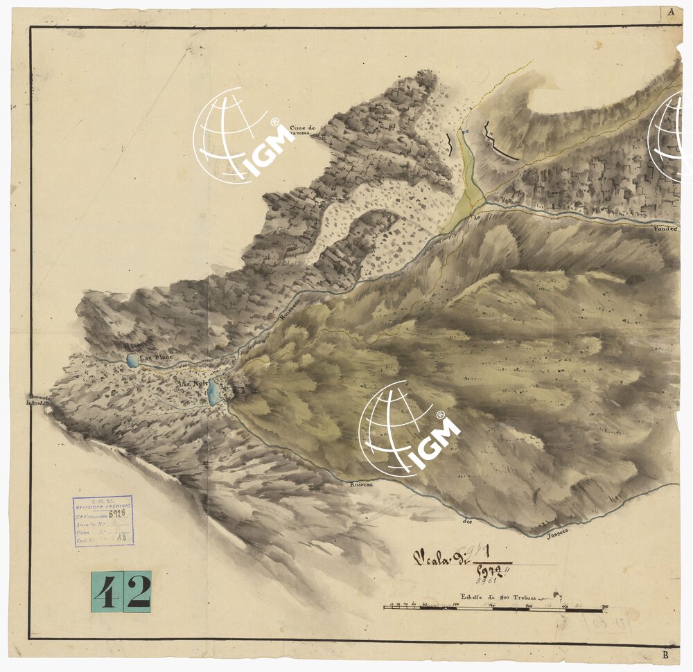 | Titolo proprio | PLAN TOPOGRAPHIQUE D'UNE PORTION DU GRAND MONTCEN QUI COMPREND DEPUIS LA GRANDE CROIX JUSQU'A LA FIN DE LA PLAINE DE S. NICOLAS AVEC LA DEMONSTRATION DES RIVES ET MONTAGNES CONTIGUES. LEVE SUR LES LIEUX PAR L'INGENIEUR AUDE' JACQUE – ALLEGATO "A" |