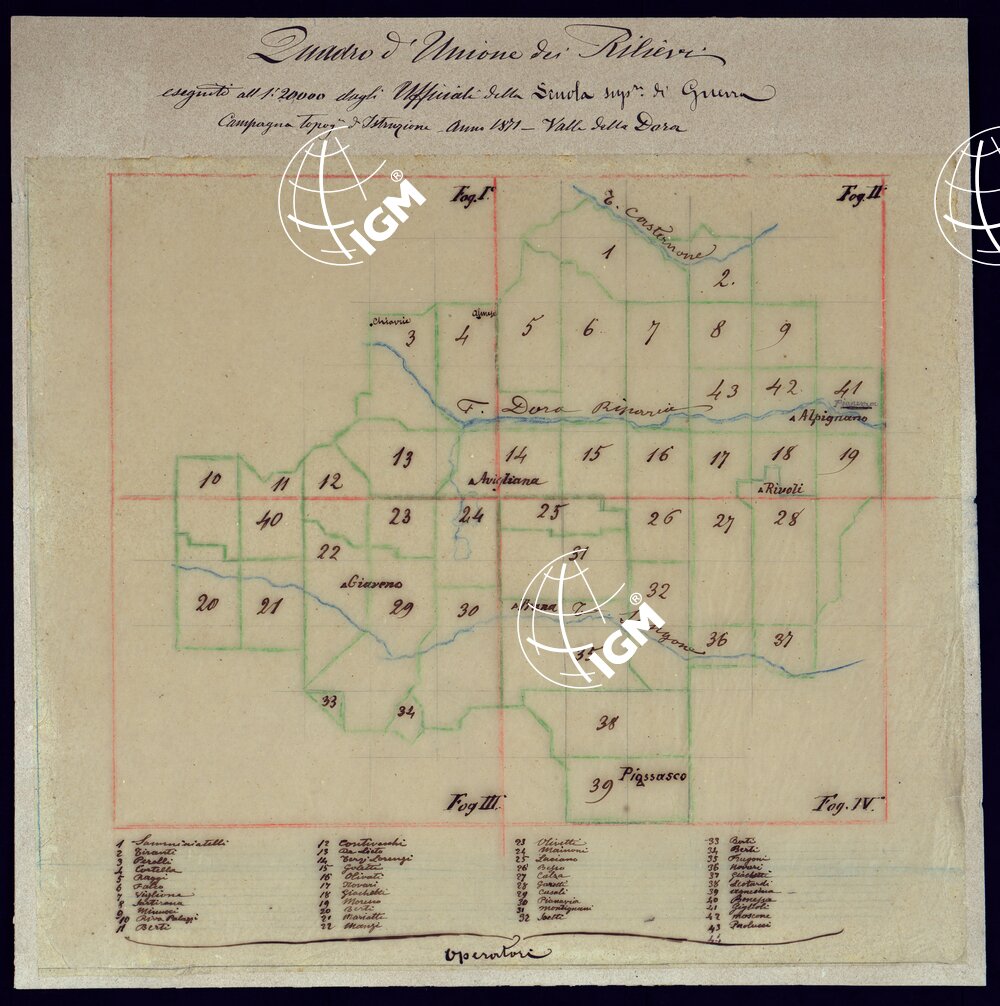 Il titolo non è presente sulla carta. Documento composto da 39 spezzoni riuniti a mosaico in 4 fogli montati su tela più un quadro d’unione. Questo materiale proviene dai rilievi di campagna eseguiti da Ufficiali della Guerra nell’anno 1871. Equidistanza di 10 m.
