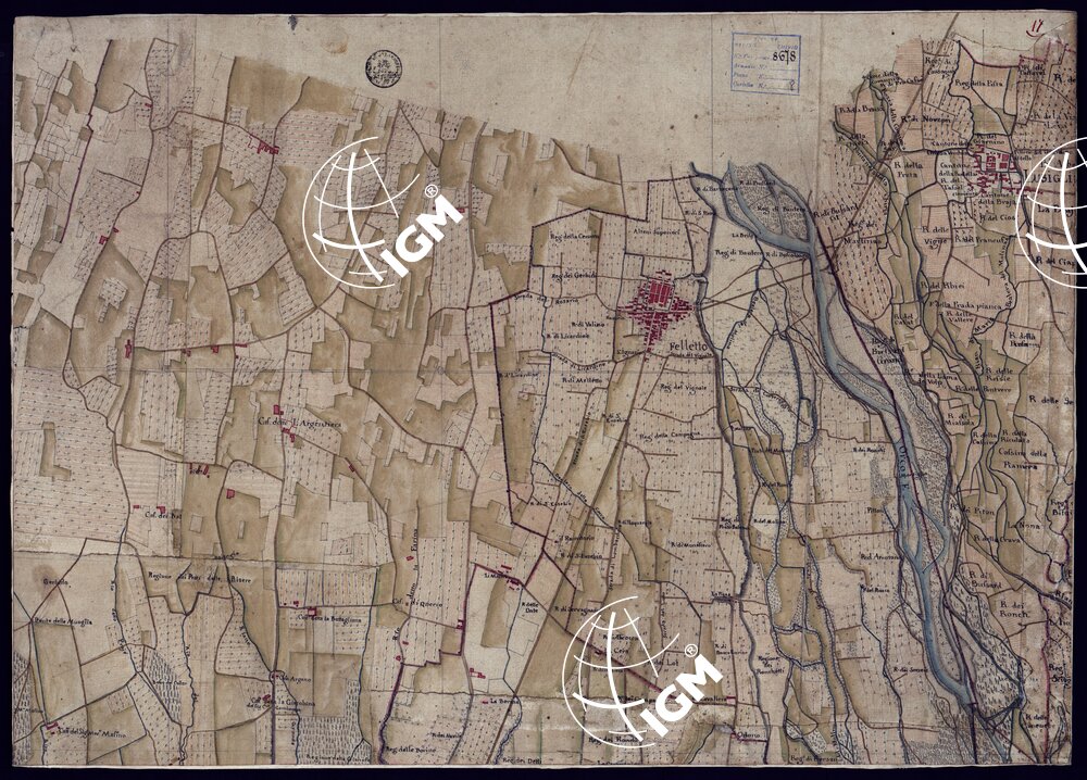 Disegno a penna, in 37 fogli, oltre un quadro d’unione, rappresentante il territorio Canavese e i Comuni limitrofi (Gassino, S. Mauro Torinese, Castiglion Torinese e Pavarolo) e cioè la regione compresa tra Ciriè, S. Mauro, il corso del Po e la Dora Baltea. Scala di 300 trabucchi = m.0,098, pari a 1:9.450. Secondo indicazioni di archivio risulterebbe formato dalla riduzione di mappe catastali. Non porta indicazioni di data , ma si può ritenere del primo quarto del secolo XIX. Sopra alcuni fogli che appaiano diversamente ritagliati da come erano originariamente, si legge: ” Originale dai Signor Avico, Borgiotti Cantù e Marchetti”. Il disegno, abbastanza accurato, riproduce con notevole precisione, come comporta la scala, tutti i particolari topografici del territorio rappresentato; cioè corsi d’acqua, rete stradale, fabbricati, limiti amministrativi. Il rilievo del suolo è rappresentato con ombreggiatura ad acquerello. Mediante colori a segni convenzionali sono indicate le colture e i boschi. Ricchissima anche la toponomastica. In complesso un eccellente documento topografico di grande interesse per lo studio delle variazioni fisiografiche ed antropogeografiche della regione.