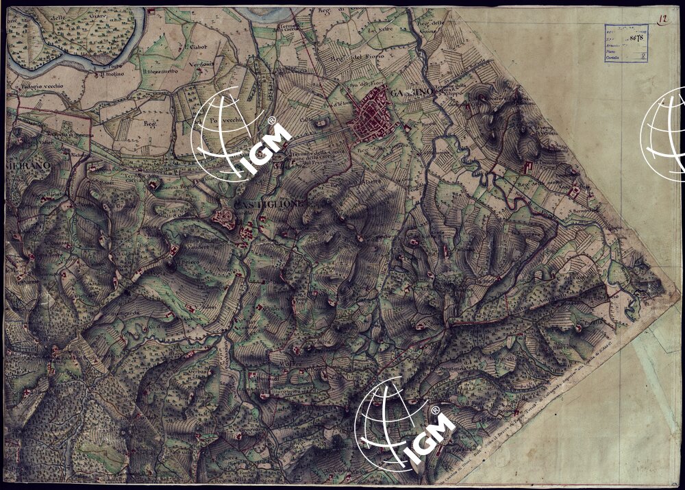 Disegno a penna, in 37 fogli, oltre un quadro d’unione, rappresentante il territorio Canavese e i Comuni limitrofi (Gassino, S. Mauro Torinese, Castiglion Torinese e Pavarolo) e cioè la regione compresa tra Ciriè, S. Mauro, il corso del Po e la Dora Baltea. Scala di 300 trabucchi = m.0,098, pari a 1:9.450. Secondo indicazioni di archivio risulterebbe formato dalla riduzione di mappe catastali. Non porta indicazioni di data , ma si può ritenere del primo quarto del secolo XIX. Sopra alcuni fogli che appaiano diversamente ritagliati da come erano originariamente, si legge: ” Originale dai Signor Avico, Borgiotti Cantù e Marchetti”. Il disegno, abbastanza accurato, riproduce con notevole precisione, come comporta la scala, tutti i particolari topografici del territorio rappresentato; cioè corsi d’acqua, rete stradale, fabbricati, limiti amministrativi. Il rilievo del suolo è rappresentato con ombreggiatura ad acquerello. Mediante colori a segni convenzionali sono indicate le colture e i boschi. Ricchissima anche la toponomastica. In complesso un eccellente documento topografico di grande interesse per lo studio delle variazioni fisiografiche ed antropogeografiche della regione.