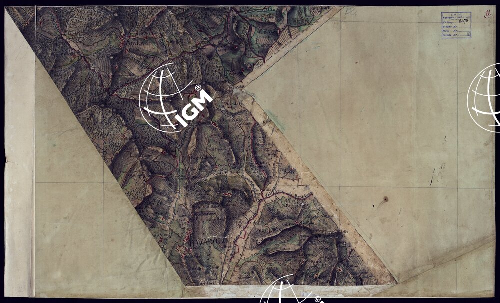 Disegno a penna, in 37 fogli, oltre un quadro d’unione, rappresentante il territorio Canavese e i Comuni limitrofi (Gassino, S. Mauro Torinese, Castiglion Torinese e Pavarolo) e cioè la regione compresa tra Ciriè, S. Mauro, il corso del Po e la Dora Baltea. Scala di 300 trabucchi = m.0,098, pari a 1:9.450. Secondo indicazioni di archivio risulterebbe formato dalla riduzione di mappe catastali. Non porta indicazioni di data , ma si può ritenere del primo quarto del secolo XIX. Sopra alcuni fogli che appaiano diversamente ritagliati da come erano originariamente, si legge: ” Originale dai Signor Avico, Borgiotti Cantù e Marchetti”. Il disegno, abbastanza accurato, riproduce con notevole precisione, come comporta la scala, tutti i particolari topografici del territorio rappresentato; cioè corsi d’acqua, rete stradale, fabbricati, limiti amministrativi. Il rilievo del suolo è rappresentato con ombreggiatura ad acquerello. Mediante colori a segni convenzionali sono indicate le colture e i boschi. Ricchissima anche la toponomastica. In complesso un eccellente documento topografico di grande interesse per lo studio delle variazioni fisiografiche ed antropogeografiche della regione.