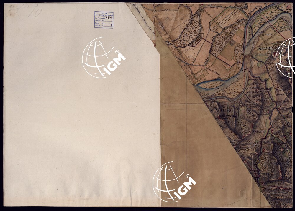 Disegno a penna, in 37 fogli, oltre un quadro d’unione, rappresentante il territorio Canavese e i Comuni limitrofi (Gassino, S. Mauro Torinese, Castiglion Torinese e Pavarolo) e cioè la regione compresa tra Ciriè, S. Mauro, il corso del Po e la Dora Baltea. Scala di 300 trabucchi = m.0,098, pari a 1:9.450. Secondo indicazioni di archivio risulterebbe formato dalla riduzione di mappe catastali. Non porta indicazioni di data , ma si può ritenere del primo quarto del secolo XIX. Sopra alcuni fogli che appaiano diversamente ritagliati da come erano originariamente, si legge: ” Originale dai Signor Avico, Borgiotti Cantù e Marchetti”. Il disegno, abbastanza accurato, riproduce con notevole precisione, come comporta la scala, tutti i particolari topografici del territorio rappresentato; cioè corsi d’acqua, rete stradale, fabbricati, limiti amministrativi. Il rilievo del suolo è rappresentato con ombreggiatura ad acquerello. Mediante colori a segni convenzionali sono indicate le colture e i boschi. Ricchissima anche la toponomastica. In complesso un eccellente documento topografico di grande interesse per lo studio delle variazioni fisiografiche ed antropogeografiche della regione.