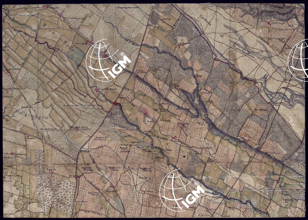 Disegno a penna, in 37 fogli, oltre un quadro d’unione, rappresentante il territorio Canavese e i Comuni limitrofi (Gassino, S. Mauro Torinese, Castiglion Torinese e Pavarolo) e cioè la regione compresa tra Ciriè, S. Mauro, il corso del Po e la Dora Baltea. Scala di 300 trabucchi = m.0,098, pari a 1:9.450. Secondo indicazioni di archivio risulterebbe formato dalla riduzione di mappe catastali. Non porta indicazioni di data , ma si può ritenere del primo quarto del secolo XIX. Sopra alcuni fogli che appaiano diversamente ritagliati da come erano originariamente, si legge: ” Originale dai Signor Avico, Borgiotti Cantù e Marchetti”. Il disegno, abbastanza accurato, riproduce con notevole precisione, come comporta la scala, tutti i particolari topografici del territorio rappresentato; cioè corsi d’acqua, rete stradale, fabbricati, limiti amministrativi. Il rilievo del suolo è rappresentato con ombreggiatura ad acquerello. Mediante colori a segni convenzionali sono indicate le colture e i boschi. Ricchissima anche la toponomastica. In complesso un eccellente documento topografico di grande interesse per lo studio delle variazioni fisiografiche ed antropogeografiche della regione.