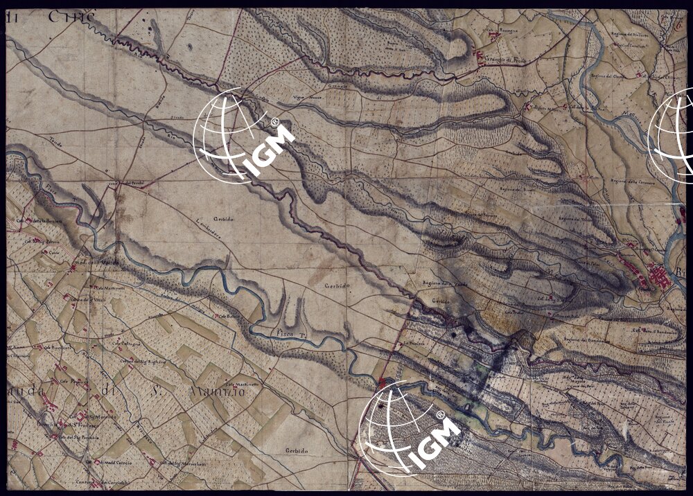 Disegno a penna, in 37 fogli, oltre un quadro d’unione, rappresentante il territorio Canavese e i Comuni limitrofi (Gassino, S. Mauro Torinese, Castiglion Torinese e Pavarolo) e cioè la regione compresa tra Ciriè, S. Mauro, il corso del Po e la Dora Baltea. Scala di 300 trabucchi = m.0,098, pari a 1:9.450. Secondo indicazioni di archivio risulterebbe formato dalla riduzione di mappe catastali. Non porta indicazioni di data , ma si può ritenere del primo quarto del secolo XIX. Sopra alcuni fogli che appaiano diversamente ritagliati da come erano originariamente, si legge: ” Originale dai Signor Avico, Borgiotti Cantù e Marchetti”. Il disegno, abbastanza accurato, riproduce con notevole precisione, come comporta la scala, tutti i particolari topografici del territorio rappresentato; cioè corsi d’acqua, rete stradale, fabbricati, limiti amministrativi. Il rilievo del suolo è rappresentato con ombreggiatura ad acquerello. Mediante colori a segni convenzionali sono indicate le colture e i boschi. Ricchissima anche la toponomastica. In complesso un eccellente documento topografico di grande interesse per lo studio delle variazioni fisiografiche ed antropogeografiche della regione.