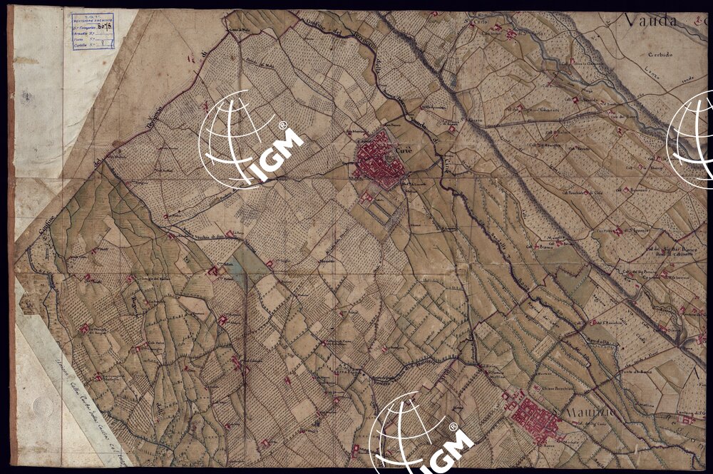 Disegno a penna, in 37 fogli, oltre un quadro d’unione, rappresentante il territorio Canavese e i Comuni limitrofi (Gassino, S. Mauro Torinese, Castiglion Torinese e Pavarolo) e cioè la regione compresa tra Ciriè, S. Mauro, il corso del Po e la Dora Baltea. Scala di 300 trabucchi = m.0,098, pari a 1:9.450. Secondo indicazioni di archivio risulterebbe formato dalla riduzione di mappe catastali. Non porta indicazioni di data , ma si può ritenere del primo quarto del secolo XIX. Sopra alcuni fogli che appaiano diversamente ritagliati da come erano originariamente, si legge: ” Originale dai Signor Avico, Borgiotti Cantù e Marchetti”. Il disegno, abbastanza accurato, riproduce con notevole precisione, come comporta la scala, tutti i particolari topografici del territorio rappresentato; cioè corsi d’acqua, rete stradale, fabbricati, limiti amministrativi. Il rilievo del suolo è rappresentato con ombreggiatura ad acquerello. Mediante colori a segni convenzionali sono indicate le colture e i boschi. Ricchissima anche la toponomastica. In complesso un eccellente documento topografico di grande interesse per lo studio delle variazioni fisiografiche ed antropogeografiche della regione.