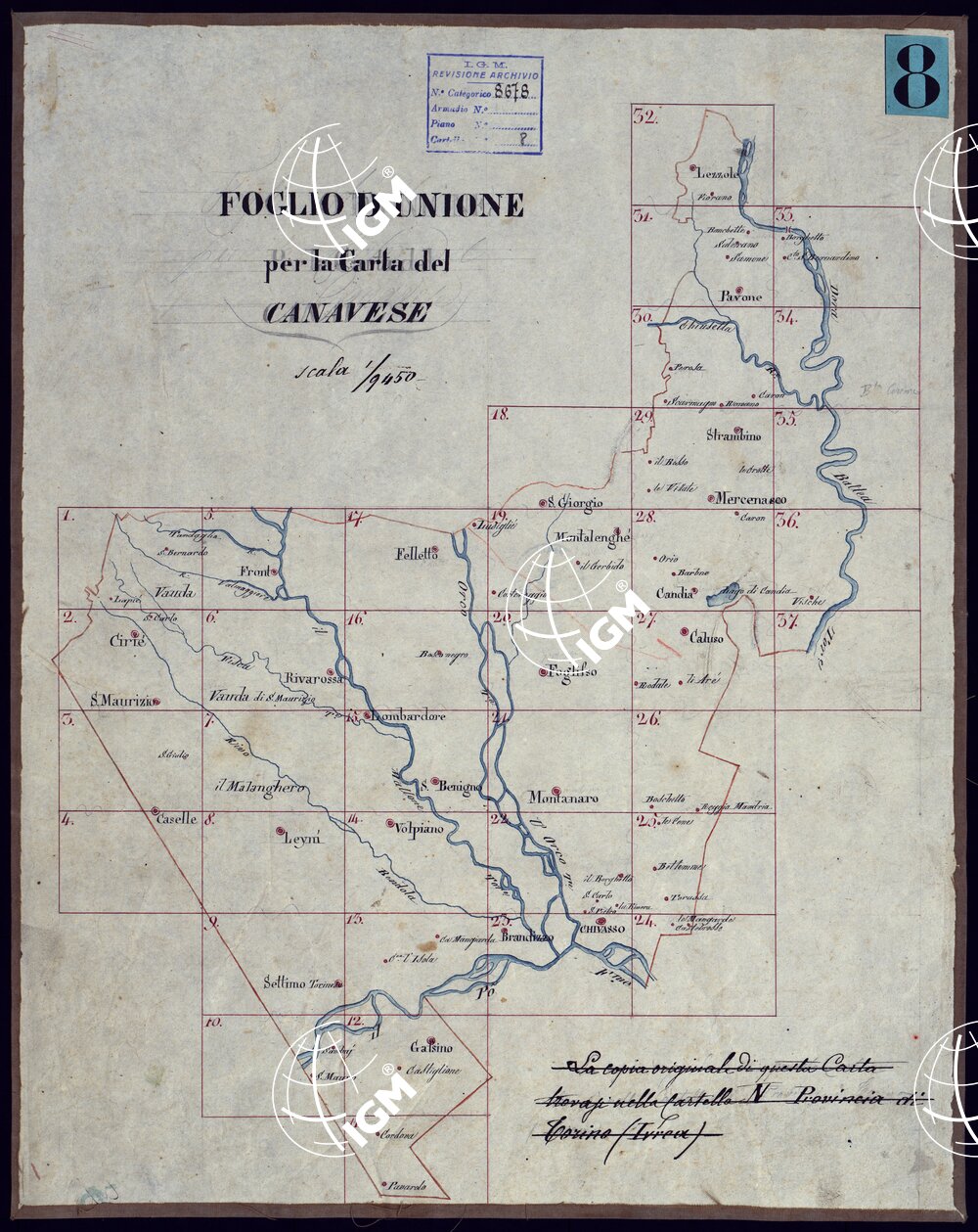 Disegno a penna, in 37 fogli, oltre un quadro d’unione, rappresentante il territorio Canavese e i Comuni limitrofi (Gassino, S. Mauro Torinese, Castiglion Torinese e Pavarolo) e cioè la regione compresa tra Ciriè, S. Mauro, il corso del Po e la Dora Baltea. Scala di 300 trabucchi = m.0,098, pari a 1:9.450. Secondo indicazioni di archivio risulterebbe formato dalla riduzione di mappe catastali. Non porta indicazioni di data , ma si può ritenere del primo quarto del secolo XIX. Sopra alcuni fogli che appaiano diversamente ritagliati da come erano originariamente, si legge: ” Originale dai Signor Avico, Borgiotti Cantù e Marchetti”. Il disegno, abbastanza accurato, riproduce con notevole precisione, come comporta la scala, tutti i particolari topografici del territorio rappresentato; cioè corsi d’acqua, rete stradale, fabbricati, limiti amministrativi. Il rilievo del suolo è rappresentato con ombreggiatura ad acquerello. Mediante colori a segni convenzionali sono indicate le colture e i boschi. Ricchissima anche la toponomastica. In complesso un eccellente documento topografico di grande interesse per lo studio delle variazioni fisiografiche ed antropogeografiche della regione.