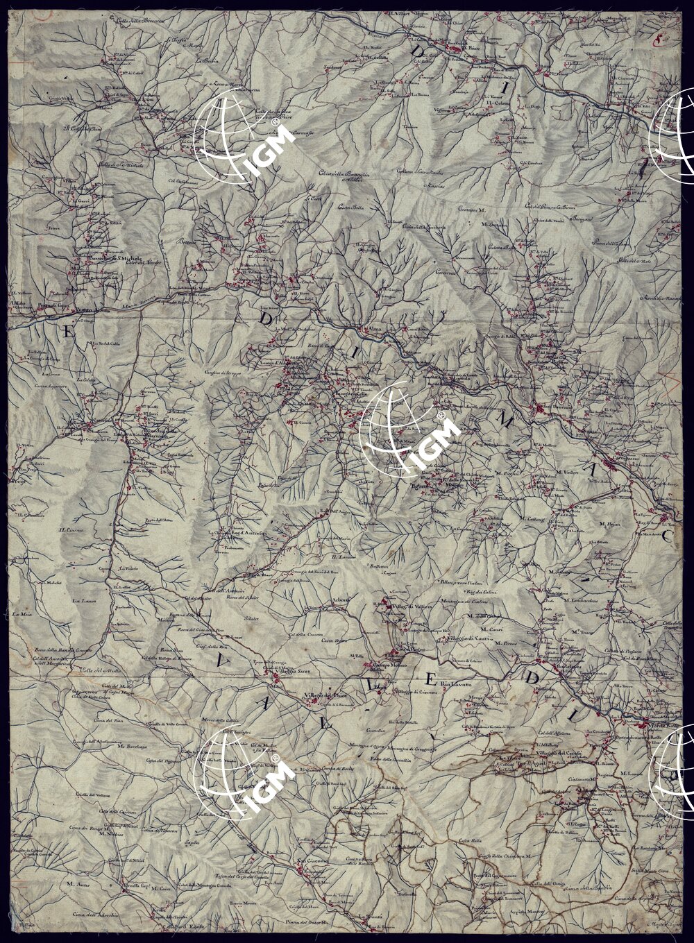 La carta senza titolo, è in sei fogli. E' disegnata a penna a più colori. Rappresenta il versante orientale delle Alpi sino a Saluzzo e Cuneo. E' molto ricca di dati topografici relativi alla rete idrografica e stradale. Orografia leggermente accennata ad acquerello. Non porta indicazione di data, nè di autore, ma può riterersi della fine del secolo XVIII o dei primi del secolo XIX.