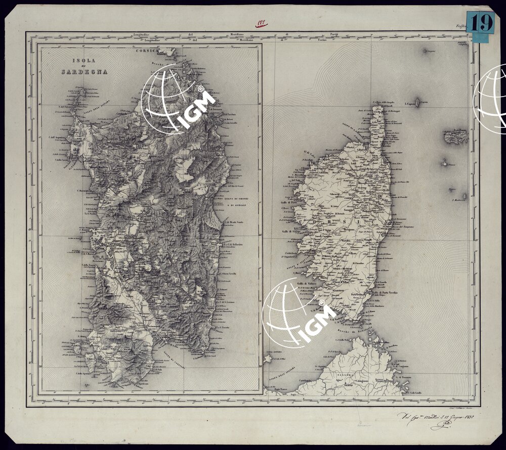 La carta è parte dei sei fogli della Carta Corografica dell’Italia Superiore e Centrale alla scala di 1:600.000 pubblicata dall’Ufficio Superiore di S. M. nel 1865. Incisione del Cattaneo. La metà di sinistra di ciascun foglio è occupata dalla rappresentazione della Sardegna (tratteggio a luce obliqua), la metà di destra dalla rappresentazione planimetrica della Corsica.