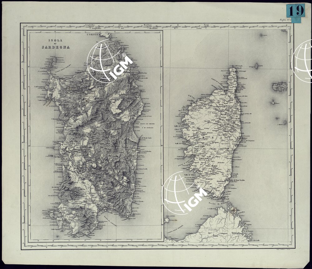 La carta è parte dei sei fogli della Carta Corografica dell’Italia Superiore e Centrale alla scala di 1:600.000 pubblicata dall’Ufficio Superiore di S. M. nel 1865. Incisione del Cattaneo. La metà di sinistra di ciascun foglio è occupata dalla rappresentazione della Sardegna (tratteggio a luce obliqua), la metà di destra dalla rappresentazione planimetrica della Corsica.
