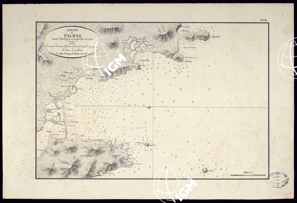 PORTOLANO DELLA SARDEGNA – CARTA IDROGRAFICA DELLA SARDEGNA LEVATA DAL CAVALIERE GIUSEPPE ALBINI CAPITANO DI VASCELLO NELLA MARINA DI S.M. SARDA – GOLFO DI PALMAS TAVOLA XXVII.