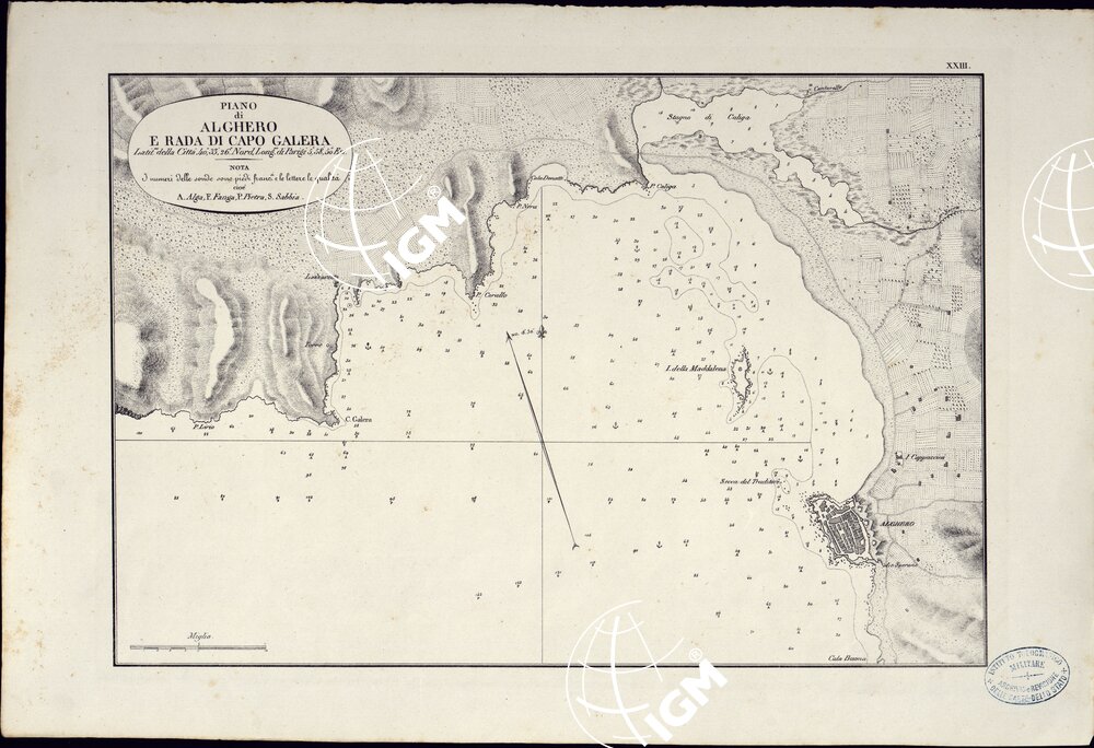 PORTOLANO DELLA SARDEGNA – CARTA IDROGRAFICA DELLA SARDEGNA LEVATA DAL CAVALIERE GIUSEPPE ALBINI CAPITANO DI VASCELLO NELLA MARINA DI S.M. SARDA – PIANO DI ALGHERO E RADA DI CAPO GALERA TAVOLA XXIII.