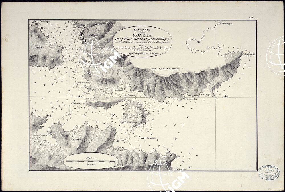 PORTOLANO DELLA SARDEGNA – CARTA IDROGRAFICA DELLA SARDEGNA LEVATA DAL CAVALIERE GIUSEPPE ALBINI CAPITANO DI VASCELLO NELLA MARINA DI S.M. SARDA – PASSAGGIO DELLA MONETA TRA L'ISOLA CAPRERA E LA MADDALENA TAVOLA XII.