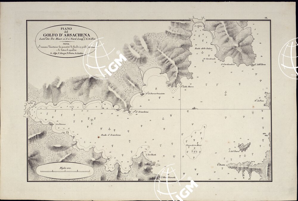 PORTOLANO DELLA SARDEGNA – CARTA IDROGRAFICA DELLA SARDEGNA LEVATA DAL CAVALIERE GIUSEPPE ALBINI CAPITANO DI VASCELLO NELLA MARINA DI S.M. SARDA – PIANO DEL GOLFO D'ARSACHENA – TAVOLA IX.
