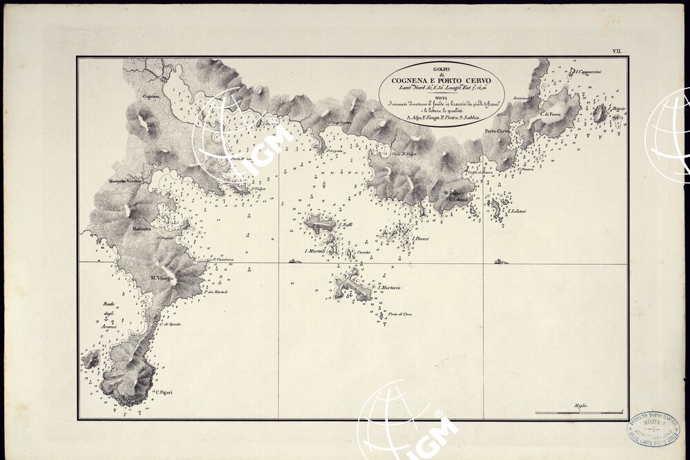 PORTOLANO DELLA SARDEGNA – CARTA IDROGRAFICA DELLA SARDEGNA LEVATA DAL CAVALIERE GIUSEPPE ALBINI CAPITANO DI VASCELLO NELLA MARINA DI S.M. SARDA – GOLFO DI COGNENA E PORTO CERVO TAVOLA VII.