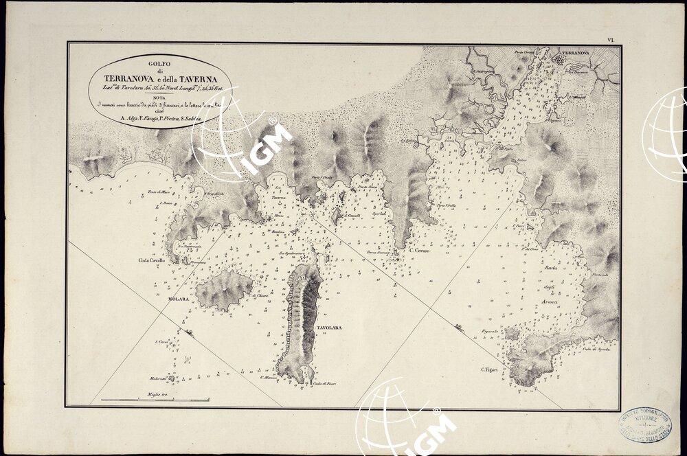 PORTOLANO DELLA SARDEGNA – CARTA IDROGRAFICA DELLA SARDEGNA LEVATA DAL CAVALIERE GIUSEPPE ALBINI CAPITANO DI VASCELLO NELLA MARINA DI S.M. SARDA – GOLFO DI TERRANOVA E DELLA TAVERNA – TAVOLA VI.
