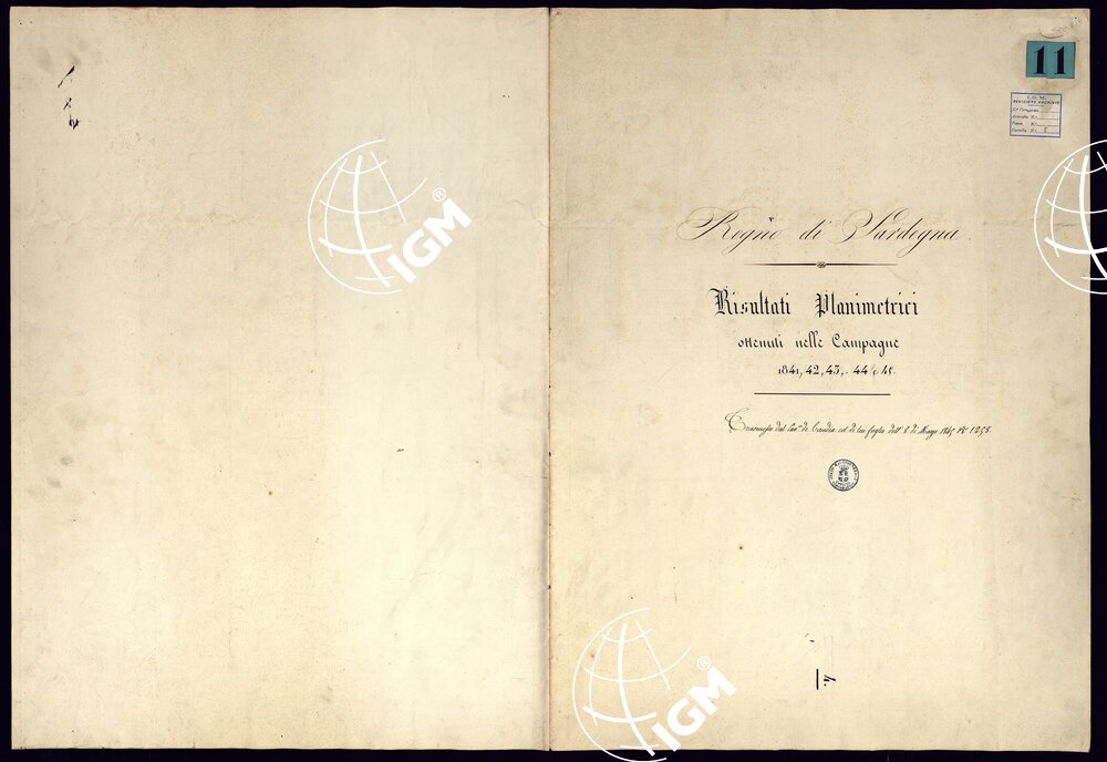 Risultati planimetrici ottenuti nelle campagne del 1841-44 per rilevamento catastale dell’isola di Sardegna. Direttore dei lavori Geodetici C. De Candia.