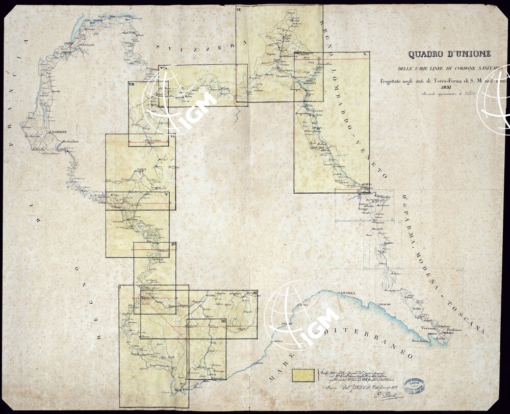 Otto fogli di diverse dimensioni, più due quadri d’unione, rappresentanti una zona lungo la linea di frontiera, per una larghezza variabile tra i 4 e i 10 km. Disegno a penna accuratissimo a più colori, acquerellato per la rappresentazione orografica con molta efficacia artistica. Confrontati con i fogli corrispondenti della Carta degli Stati Sardi al 50.000, si mostrano più ricchi d’indicazioni topografiche e toponomastiche. Segni convenzionali speciali indicanti i Corpi di guardia e i distaccamenti della 1a e 2a linea per le truppe del Cordone Sanitario. Non portano indicazione di autore; ma una registrazione d’Archivio dice che per tradizione di ufficio sono attribuiti al Brambilla.